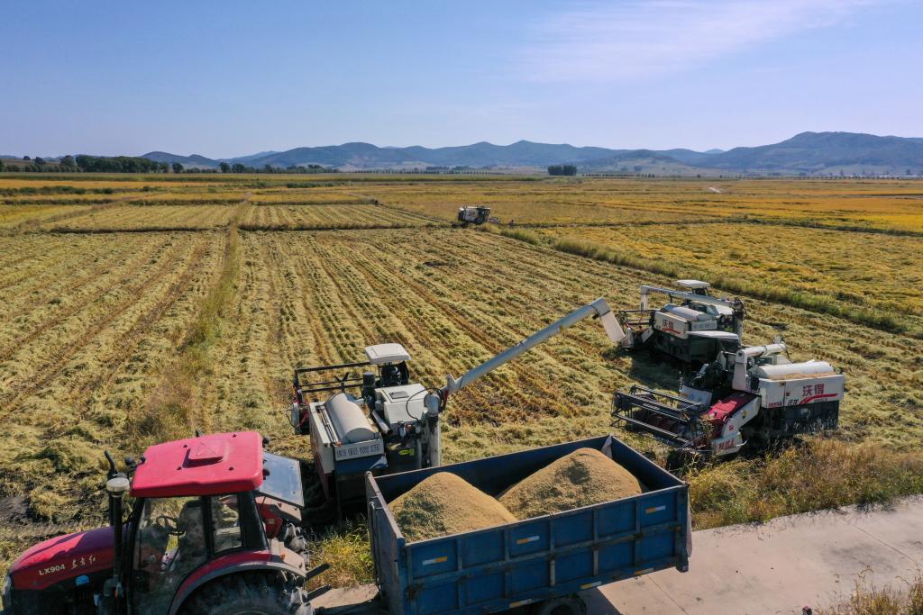 10月14日,在吉林省公主岭市,吉林省米兜种植农民专业合作社进行机械化收割水稻作业展示(无人机照片)。