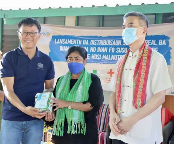 5月11日,刘大耕(左)和中国驻东帝汶大使肖建国、东帝汶卫生部长奥德嗒参加中国援助营养谷物粉发放仪式。